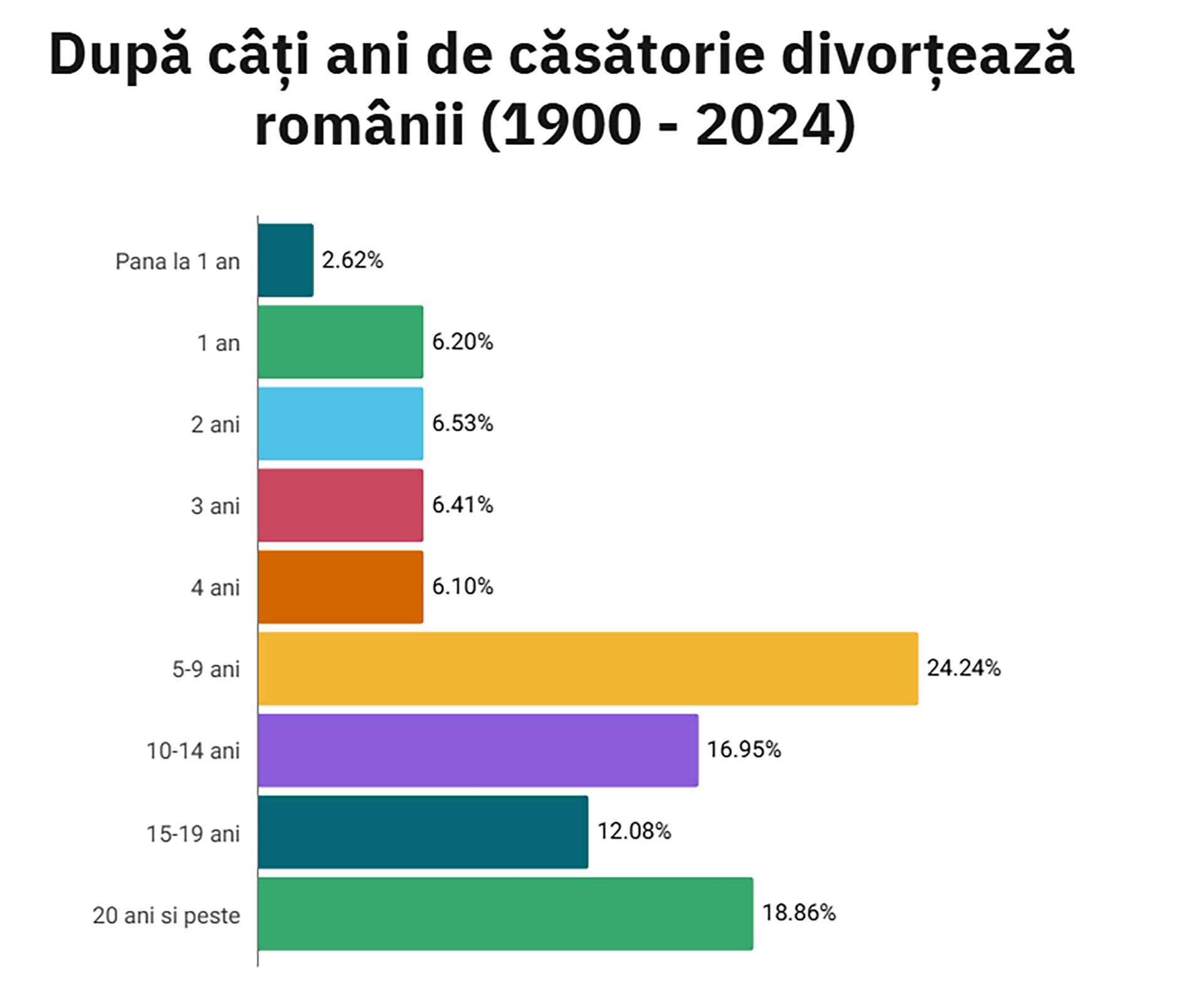 - 24,2% dintre separări au avut loc după 5–9 ani de căsnicie