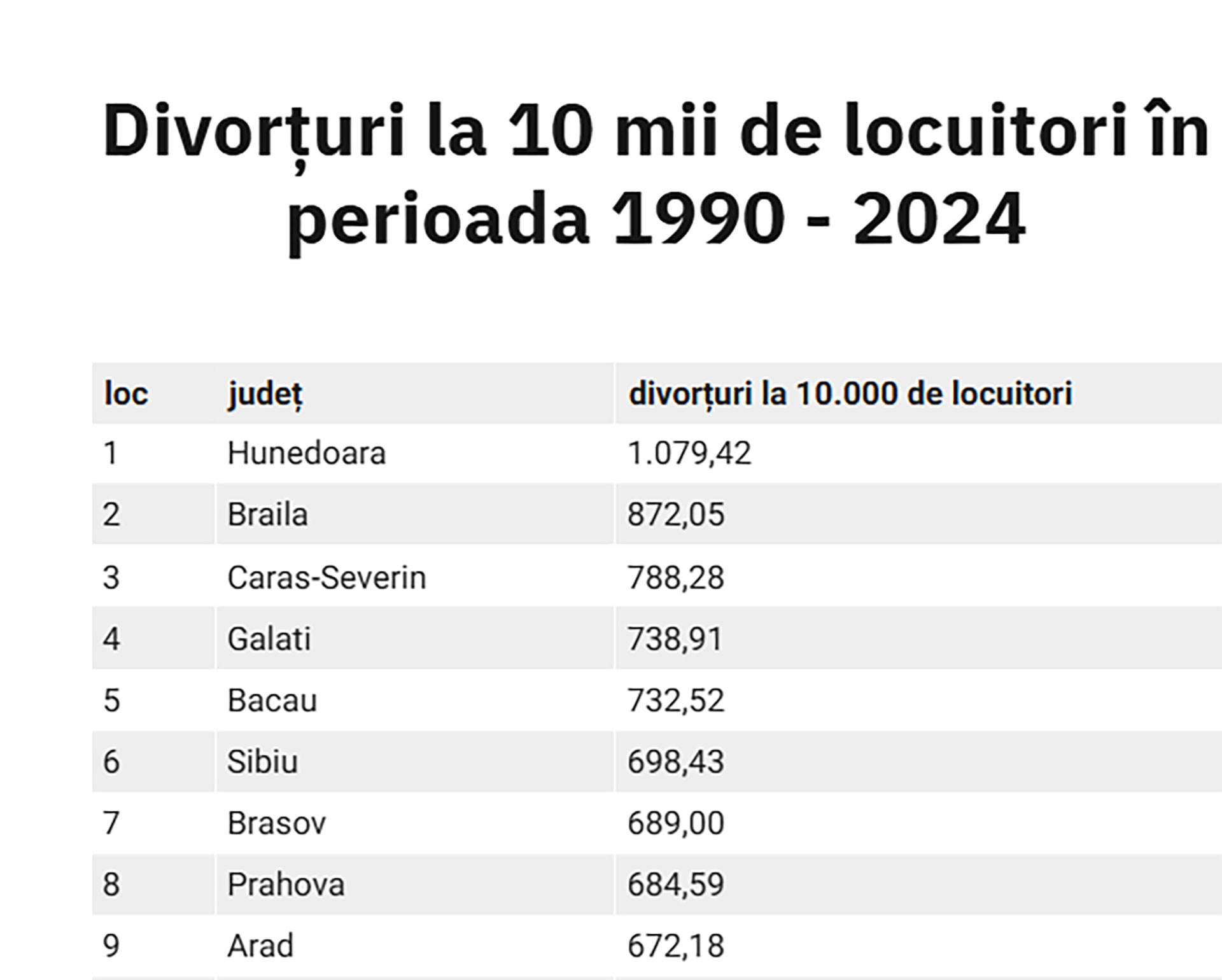 - Hunedoara – 1.079 divorțuri la 10.000 de locuitori