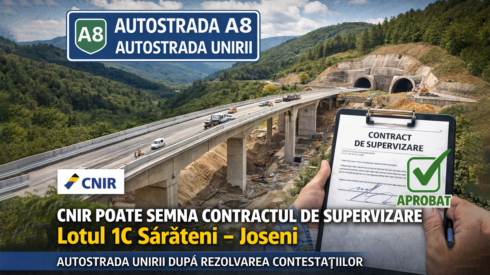 Compania Națională de Investiții Rutiere (CNIR) poate semna contractul de supervizare pentru lotul 1C Sărățeni – Joseni al Autostrăzii Unirii A8, după ce Consiliul Național pentru Soluționarea Contestațiilor (CNSC) a respins cele două contestații depuse în procedura de atribuire.